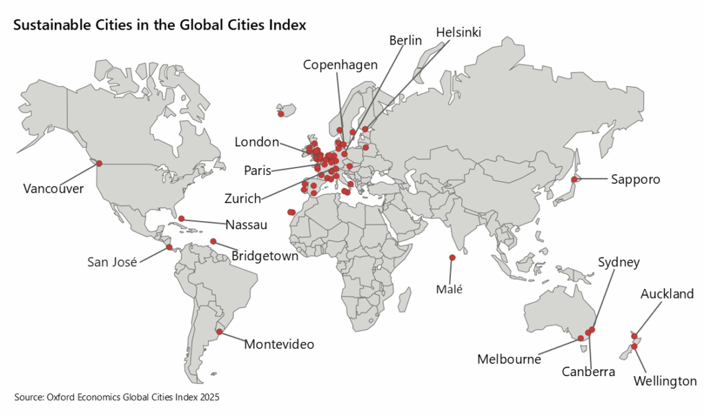A key question, therefore, is: which cities are currently on a sustainable path? Our latest update of the Global Cities Index—a comprehensive ranking of the 1,000 largest cities worldwide—helps shed light on this. The index evaluates city performance using five pillars: economics, human capital, quality of life, environment, and governance. But as part of our 2025 analysis, we have developed a typology of eight distinct city archetypes to identify common patterns and trajectories among major global cities. One of these archetypes is the Sustainable City.