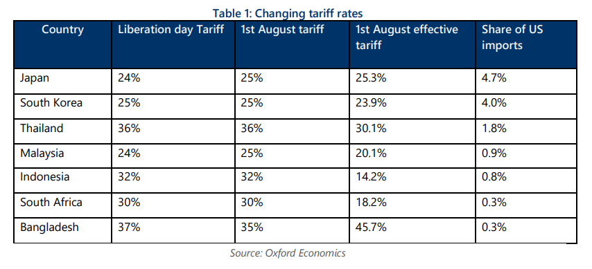 - While details of the new tariff scheme remain thin, communications suggest exemptions to the tariffs will remain consistent with the previously announced. This includes the sector-specific tariffs (including on steel and aluminium and autos) and some critical imports for the US (including semiconductors, pharmaceuticals and energy). Assuming the current exemptions remain in effect, each country’s new effective tariffs are listed below.