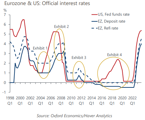 A scenario where neither the Federal Reserve nor the European Central Bank cut rates in 2024 would reduce eurozone GDP by 0.5ppts by 2025. We still think the eurozone economy would grow by 0.5% in 2024, but the projected expansion in 2025 would be 1.4%, lower than 1.8% in our baseline forecast.