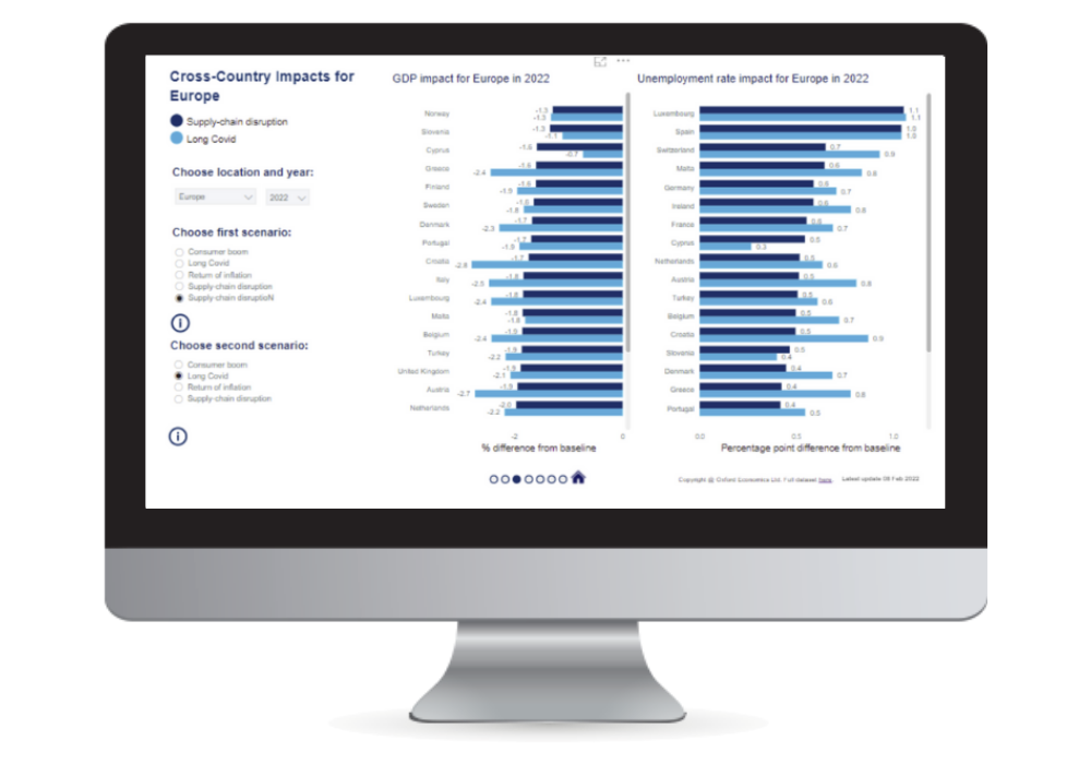 当社独自のグローバル経済モデルを用いて、主要なリスクが世界経済に及ぼす影響を分析します。リスクが発生した場合、ベースライン予測(例:GDP、消費、金利)がどの程度上振れまたは下振れするのかをシミュレーション。各リスクシナリオの特徴とベースライン予測および向こう5年間の見通しを示したレポートとデータセットを提供。
