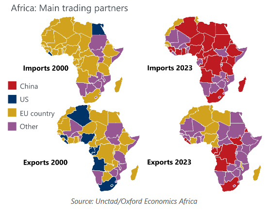 • China is Africa’s largest trading partner, securing around 60% of the DRC’s copper and all its cobalt exports in 2023. It has shifted from a resource extraction focus to broader engagement through infrastructure, digital exports, and tariff-free trade policies, though its influence still raises concerns about “debt trap diplomacy.