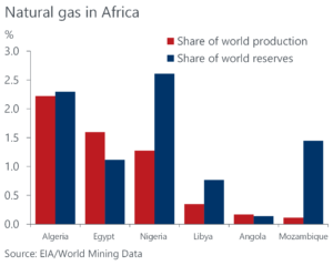 The outlook is more positive in countries such as Senegal and Tanzania. Grand Tortue Ahmeyim (GTA), a gas field straddling the border between Senegal and Mauritania, is estimated to hold 15 trillion cubic feet of gas. Senegalese authorities are confident GTA’s Phase I production target date of late-2023 will be met, while a final investment decision on Phase II is expected by end 2022 or early 2023. In addition to GTA, the Yakaar-Teranga gas field is estimated to hold 15 trillion to 20 trillion cubic feet of gas, with an investment decision by British energy giant BP expected this year. Gas finds such as those in Senegal – given the size of the fields and proximity to Europe – are likely to be increasingly attractive investment opportunities.