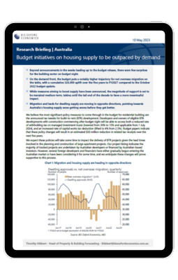 • On the demand front, the budget puts a notably higher trajectory for net overseas migration on the table, with a cumulative 320,000 uplift over the five years to FY2027 compared to the October 2022 budget update.