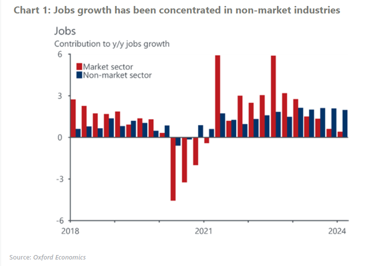 - ‘Non-market’ industries (education, health and public service) made up around 4 in 5 new jobs added over the year to Q1. The NDIS expansion has been a key contributor to this runup in hiring. The market sector is lacking a clear engine of growth, and we expect non-market industries will continue to drive gains in employment.