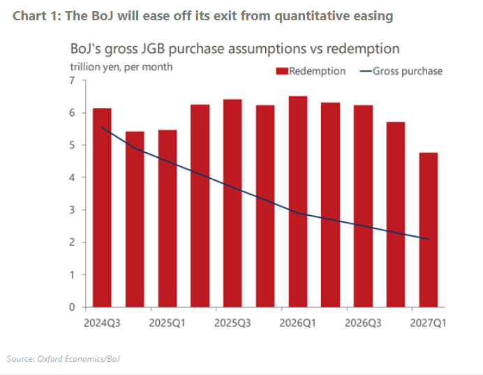 The Bank of Japan kept its policy rate at 0.5% and announced its exit plan from quantitative easing at Tuesday’s meeting. Following a recent spike in ultra-long JGB yields, the BoJ decided to ease off the pace of reducing JGB purchases in FY2026.