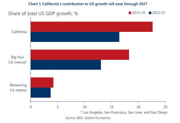 Despite strong growth in recent years, the California economy is facing multiple challenges, not least to its key entertainment and technology sectors. We forecast that the big four Californian metros will contribute a smaller share of total US growth in the next five years than in the recent pre-pandemic past. But other Californian metros will have more impact, as firms move to smaller towns, whose amenities attract graduates and families, and as other sectors maintain or increase their significance.