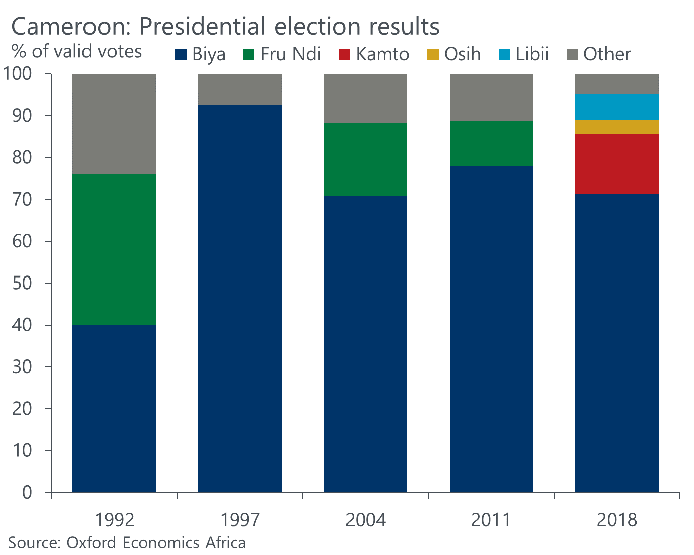 Since its first presidential election victory in 1984, Paul Biya’s CPDM has established itself as a powerful electoral force, effectively mobilizing financial and positional resources to reward supporters and secure block votes. Despite internal factional battles, the party has unified temporarily to ensure Biya’s re-election. In contrast, the fragmented opposition, with nine candidates, has failed to consolidate support around a single consensus candidate, significantly diminishing its chances of challenging Biya’s dominance.