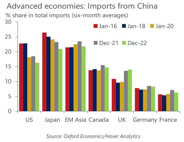 - The share of US imports coming from China has resumed its downward trend after briefly recovering during the pandemic. Chinese industries hit by US tariffs have particularly suffered, with US imports from these sectors perhaps 40%-50% lower than they would have been in the absence of tariffs. Besides the US, evidence of trade decoupling is harder to find.