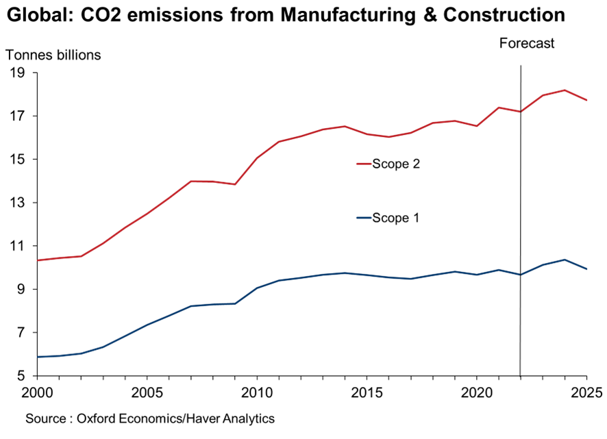 This challenge is most pronounced in manufacturing and construction, whose global CO2 emissions have risen significantly since 2000. 45% of this increase comes from emissions associated with the electricity and heat consumed by these sectors (Scope 2); direct (Scope 1) CO2 emissions increased until 2010 but have broadly flatlined since then.