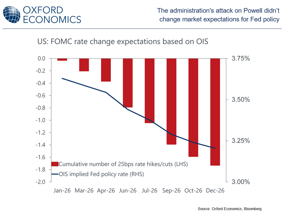 • The criminal investigation into Fed Chair Jerome Powell doesn’t alter our forecast for Fed policy either.