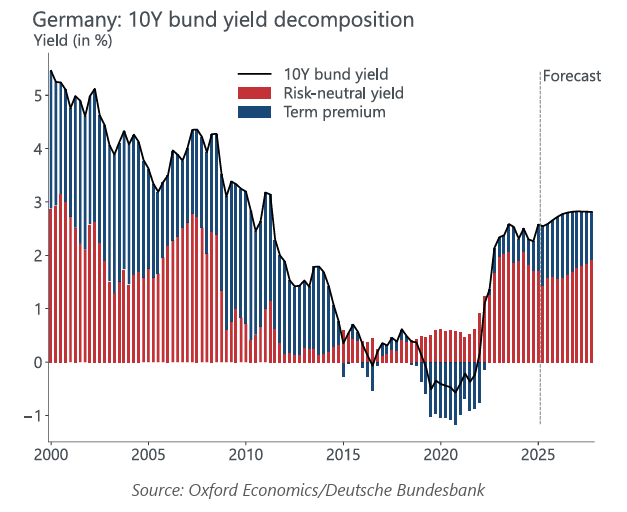 We expect 10-year bund yields to increase towards 2.8% by late 2026, as the term premium remains around 1.1% and the risk-neutral yield climbs above 1.7% over the next few quarters. Although national and geopolitical events clearly drove bund yields recently, the structural post-pandemic economic shifts, such as higher interest rates and challenges to the German business model, will remain in place, keeping yields elevated.