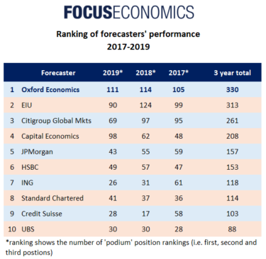 FocusEconomics ‘Best Economic Forecaster Awards’ ranks Oxford Economics top most consistently over last 3 years