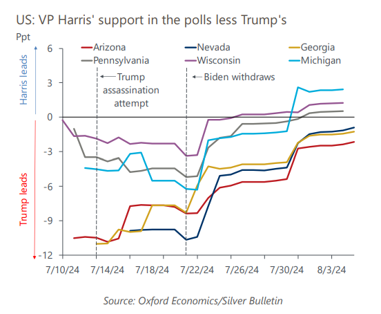 - Pennsylvania is the biggest prize of these three swing states, and we find that county election outcomes in the Keystone State are especially sensitive to changes in unemployment. According to our models, higher joblessness, even if from extremely low levels, dings Harris’ support. In 2016, rising unemployment, particularly in the bellwether county of Erie, hinted at trouble for former Secretary of State Hillary Clinton.