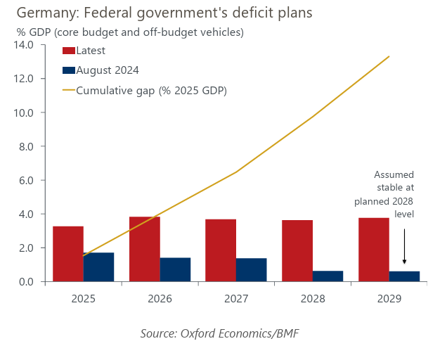 - However, we’re unconvinced that the plans will materialise in full. The budget is even more tilted towards investment than we thought, but defence and construction firms will struggle to absorb all the funding. We therefore don’t plan major changes to our medium-term growth forecasts.