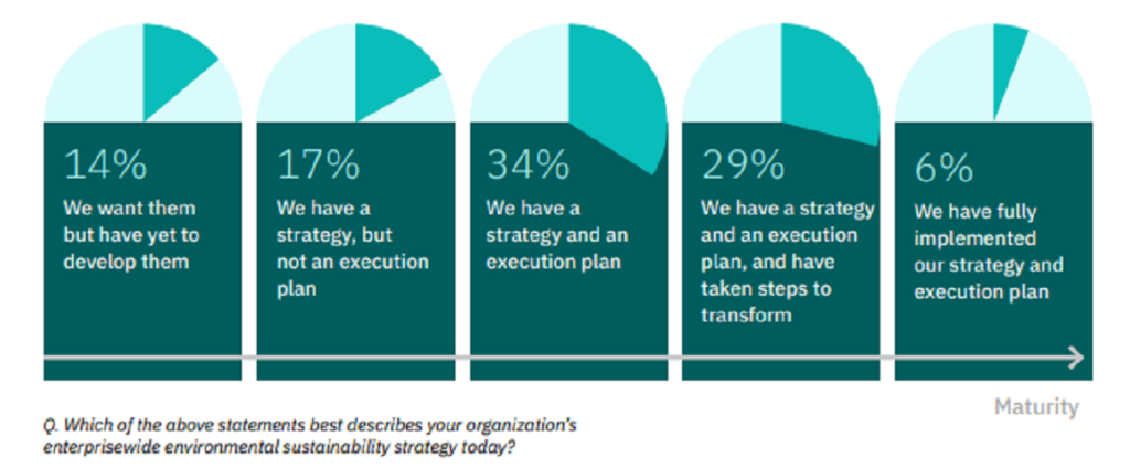 The next step is for business leaders and investment houses to identify and invest in those opportunities. Here the progress report is mixed. 86% of companies in a recent Oxford Economics and IBM survey collaboration claimed to have signed up to an enterprise-wide sustainability strategy. But little more than a third of companies from the same study could say they had taken actions to attain their sustainability goals.