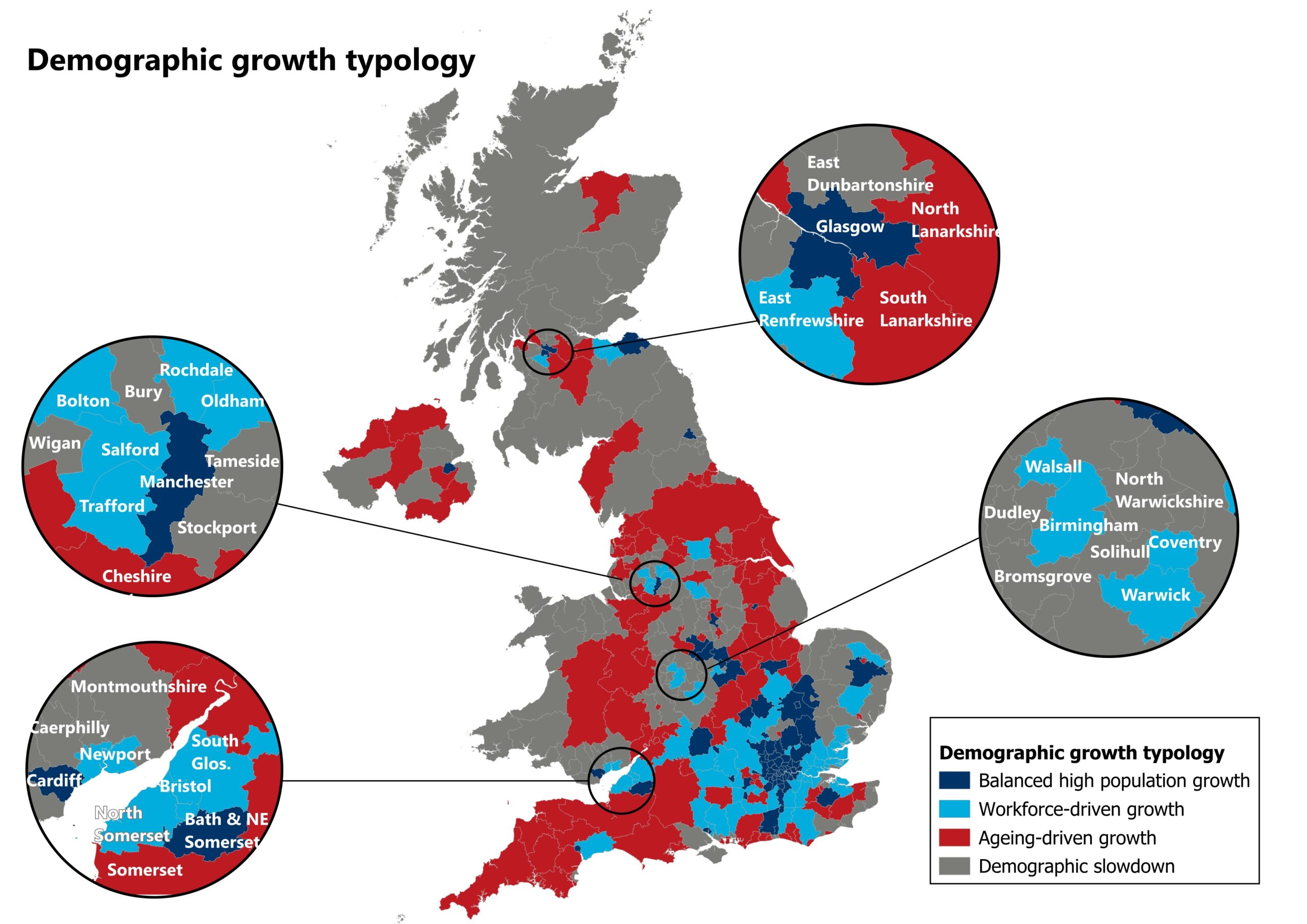Yet, as observed elsewhere in Europe, the UK population is ageing. And with the latest ONS data showing the UK’s fertility rate has fallen to the lowest rate on record, further pressure is being placed on these already concerning demographic trends. This will have implications for the demand for health and social services, spending on pensions, and tax revenues, while a shrinking working-age cohort will pose challenges to the labour supply. But due to varying demographic trends at the local level, what this means for investment needs and priorities will be location specific.