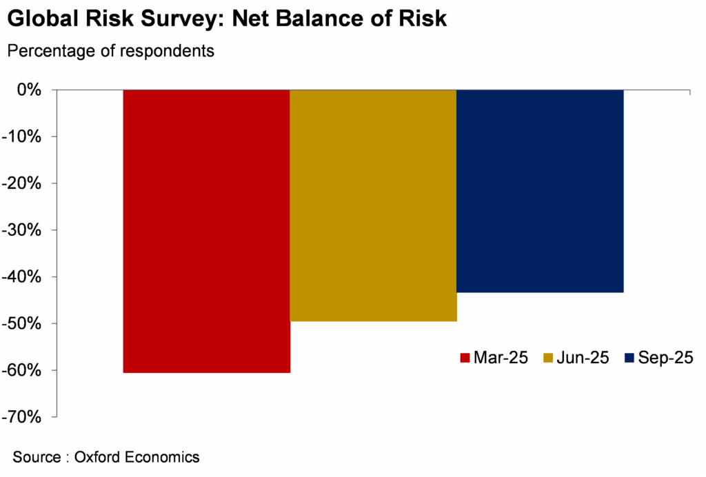 The protectionist measures that come with this trade agenda have cast a long shadow over business and investor sentiment this year. Businesses were especially anxious after Liberation Day, when the scale of impending tariffs and the resulting economic fallout remained deeply uncertain. As negotiations progressed over the year and deals took shape, increased clarity over policy outcomes and the extent of the resulting economic downturn has since helped steady executives’ nerves. We track our clients’ assessment of the risk outlook in our Global Risk Survey, which saw a steady improvement in the net balance of risk since the start of the year (see chart below).