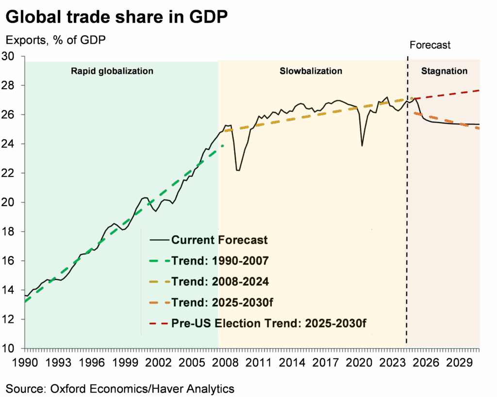 Over the past year, the effects of tariffs and other protectionist trade measures have re-emerged as a central risk to global GDP growth. The policies from President Donald Trump’s administration have injected heightened uncertainty into the previously established rules of global trade, having oscillated between tariff threats, deadline extensions and ad-hoc deals. This has had a significant impact on the trade outlook at a global level, especially when viewed in a historic context. Trade’s share of global GDP surged in the 1990s and early 2000s as supply chains expanded and trade liberalisation accelerated. But growing concerns over the vulnerabilities stemming from deep cross-country integration have since led many countries to reassess their reliance on foreign markets, slowing trade’s growth relative to economic output. Under the Trump administration that deceleration is expected to intensify, signalling a shift from the previous era of ‘slowbalization’ to a period of trade stagnation.