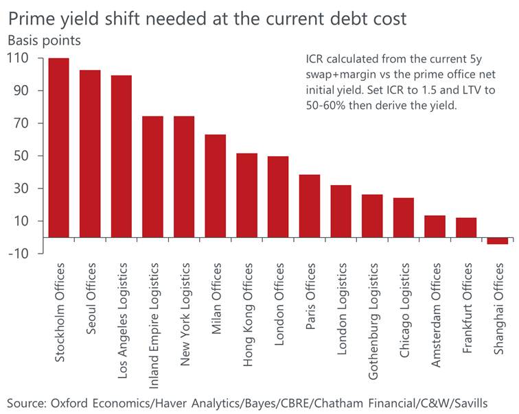 Assuming a loan that’s 50% to 60% of value and at a low-risk interest coverage ratio, investors require a 26% price correction for the Stockholm office market, taking prime yields to 4.2%, up 110 bps from the current prime yield. A 25% correction is needed for the Los Angeles logistics market, with prime yields moving out by 100 bps to 4%. Also in Europe, the Milan and London office markets require prime yields to correct by 65 bps and 50 bps. In the Asia-Pacific region, we estimate that the office markets of Seoul and Hong Kong should see a pricing correction of 25% and 15% respectively, a big shift from no correction implied just three months ago.