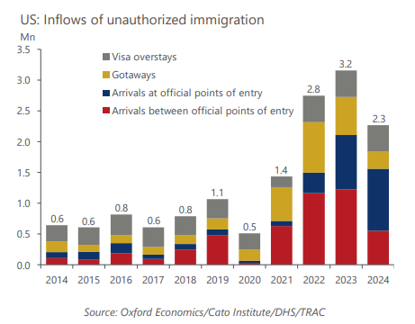 We created a real-time tracker of unauthorized migrants to the US, the driving force behind the nation’s post-pandemic immigration surge. New undocumented migrants in the US will total 2.3mn this year, nearly 1mn lower than in 2023.