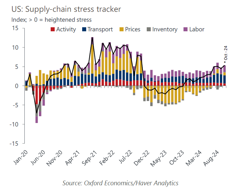 - Some of the added supply-chain stress is self-inflicted. We identify three reasons why retailers and manufacturers will likely frontload shipments ahead of January: a second potential port worker’s strike, new tariffs under the Trump administration, and the Chinese Lunar New Year.