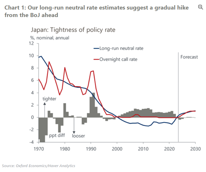 We estimate that Japan’s nominal neutral interest rate – the rate consistent with monetary policy that is neither stimulative nor restrictive – has risen somewhat since 2022, marking a striking reversal from its decades-long slide. More importantly, we project it to continue rising gradually, to around 1% by 2030 from 0% in 2023.