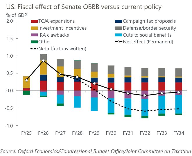 • After this week, the focus shifts from fiscal to trade policy, and the likely passage of the bill has implications for the looming July 9 tariff deadline.