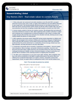 We expect real estate values to correct sharply in 2023, but pressure should gradually alleviate as policy rates peak. We’ve identified five key themes that will shape both the scale of the downturn and the pace of the subsequent recovery.