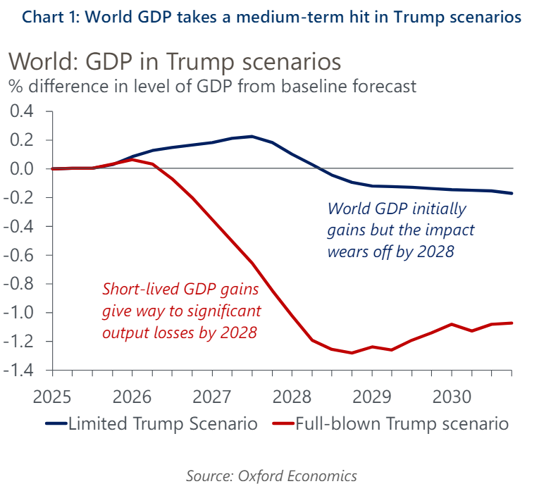 Two scenarios in which former President Donald Trump returns to the White House in the 2024 election show global GDP taking a medium-term hit of 0.2%-1.3% after some short-term gains.