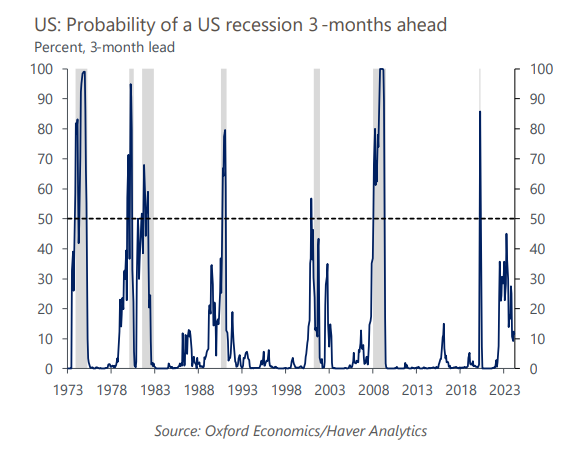 • While the sentiment-based and macro indicators we identified provide a strong fit in proceeding recessions dating back to 1973, their signal is limited to the six- or nine-month horizons, depending on the indicator. This contrasts with the signal from the yield curve model, which improves as the horizon increases. Our three- and six-month models show recession risks are at their lowest levels since the two consecutive quarters of negative growth in 2022.