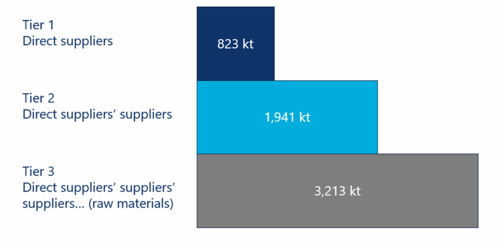 We can work with clients to inform these questions by combining their data with an environmentally enhanced global input-output model to bridge the gaps. By mapping procurement data against global emissions intensities, we can estimate impacts across Tier 1 suppliers, their suppliers (Tier 2), and even raw material extraction (Tier 3).