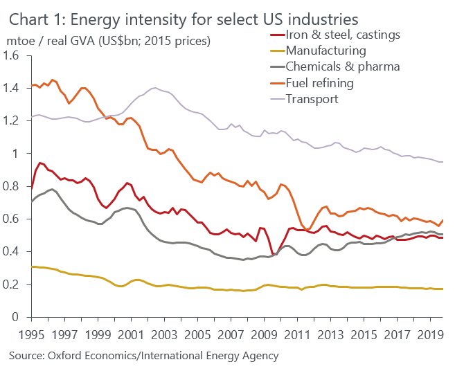 It is worth noting that the pace at which intensity has fallen has slowed over the last decade, and in some rare cases has increased. For example, in the US chemicals sector, new supplies of cheap gas from shale formations have yielded a sharp increase in gas consumption in the sector from 2008/9 onwards, raising energy intensity (Chart 1).