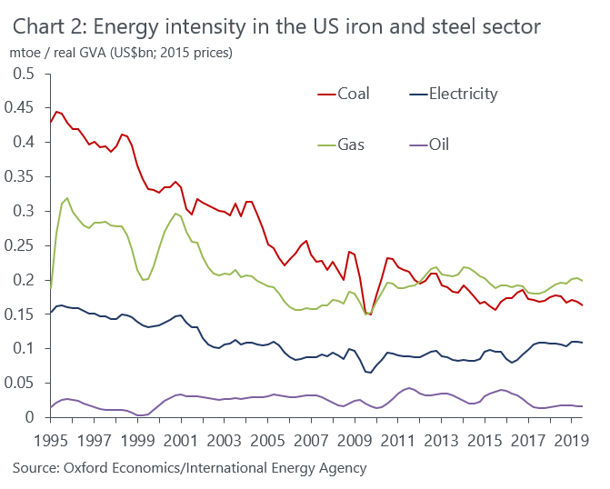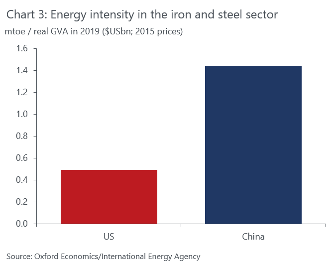 It could also be that the more energy-intensive aspects of production have been offshored to other countries, while domestic production has turned to higher value-added aspects of the supply chain. Chinese iron and steel production, for instance, is significantly more energy intensive than in the US (Chart 3).