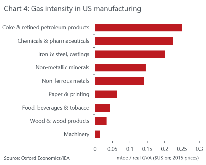 We recently added a series of energy indicators to Oxford Economics’ Global Industry Service, allowing us to assess the prospects for energy demand, intensity, costs and carbon emissions on a sector-by-sector basis for 49 economies out to 2050. This rich set of energy history and forecast data, which draws upon data published by the International Energy Agency, opens the door to a new range of industry-level insights and analysis.Our new data reveal that there is considerable variation across sectors in terms of their energy intensity (see Chart 4). Within manufacturing, the most energy-intensive sectors tend to be coke and refined petroleum products, chemicals and pharmaceuticals, and iron and steel production.