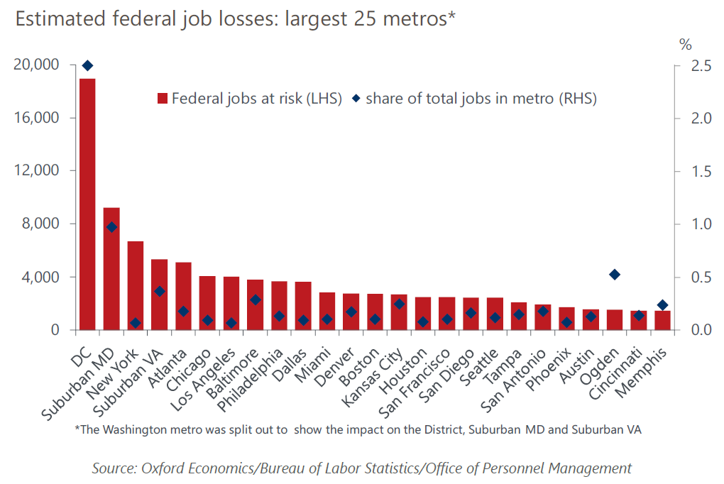 Cuts to the Federal government workforce, which we estimate to be 200,000 in 2025, will have a modest impact nationally, but more significant implications for the Washington, DC metropolitan economy as it accounts for 17% of all non-military federal jobs in the US.
