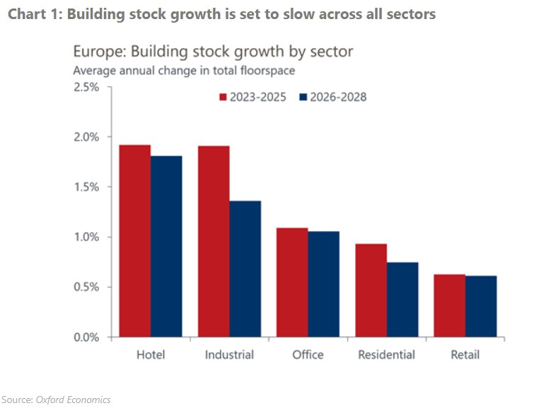 Our development pipeline data suggest European building stock growth will slow across all five of the major property sectors over the next three years.