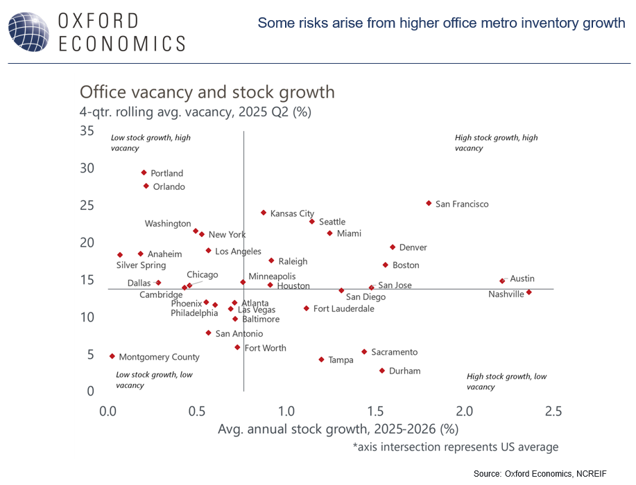 - For industrial, metros with robust construction pipelines over the next two years like Las Vegas, Denver, Charleston, Fort Worth, and San Antonio are grappling with vacancy rates more than double the national average. By contrast, some coastal and gateway markets face far lighter supply pressure.
