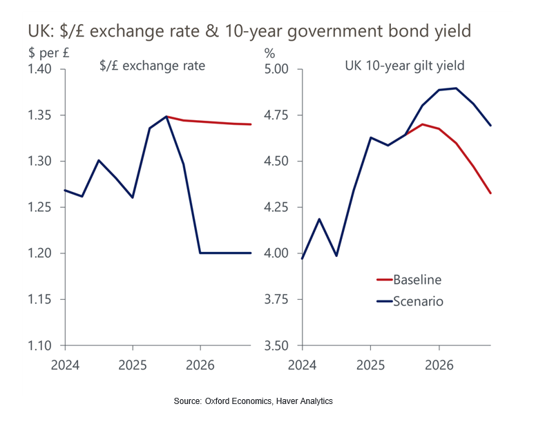 - We’ve used our Global Economic Model to construct a scenario where markets react negatively to the Budget. A weaker pound would exacerbate the UK’s inflation problems and discourage the Monetary Policy Committee from resuming rate cuts in early 2026. We think the government would then belatedly change its fiscal approach, cutting spending to try to restore confidence.