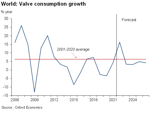 However, this gloomy outlook does have a silver lining. We believe growth will resume as these shocks start to dissipate through 2023, thanks to robust expansion in emerging markets. Sanctions-related damage to the Russian economy has been smaller than initially expected, while China is expected to rebound as the economy emerges from Covid-19 lockdowns. Indeed, we expect a return to double-digit growth in Asia in 2022. This is mainly driven by a strong outlook for the Indian market; valve and actuator demand growth is forecast to steadily accelerate over the 2024-2026 horizon.