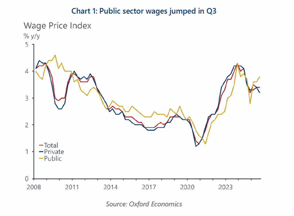 The WPI rose 0.8% q/q in Q3, keeping annual wage growth unchanged at 3.4%. While the WPI is a lagging indicator, the stability supports our view that the labour market remains tight.