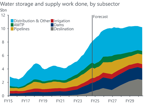 Federal and State governments are actively increasing investment in water infrastructure, particularly in regional and high growth areas to address current and future water needs. However, in some areas these efforts may be coming too late – existing water infrastructure capacity in places like Adelaide have already led to challenges in meeting residential construction demand. This situation underscores the essential role of water in economic activity.