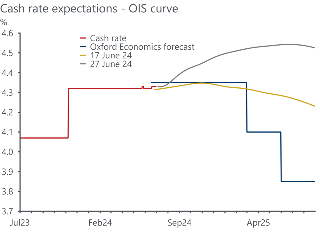 - We maintain our forecast that the RBA’s next move will be a rate cut, which we have penciled in for February 2025.
