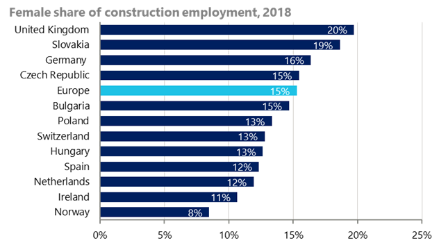 Chart 1: The UK leads Europe with around 20% of the construction workforce being women