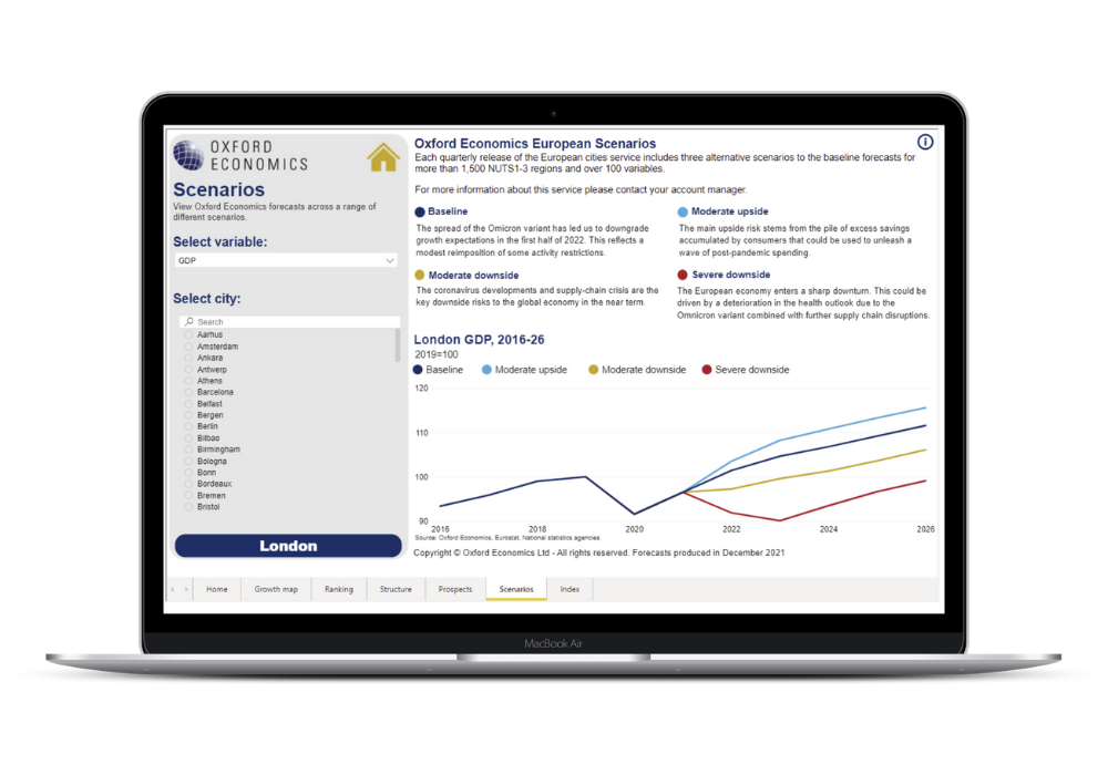 Oxford Economics’ City Scenario Service quantifies how upside and downside risks to the economy might affect individual cities and regions in Europe and North America.