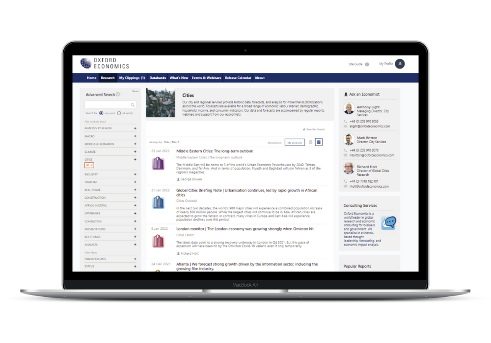 • Confidence. Our forecasts are derived from a consistent set of global economic, industry and city models and supports your planning for possible future economic downsides.