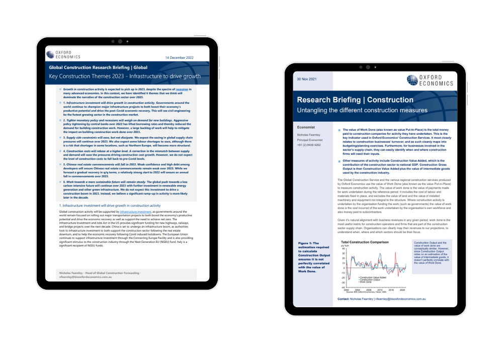 Oxford Economics Australia’s established methodology allows for cross-country comparison, including the various segments of the construction industry.