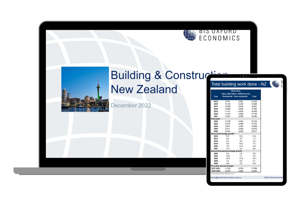 Insight into the building and construction industry throughout New Zealand. Using Oxford Economics Australia's established methodology, the New Zealand Forecasting Service provides detailed overviews of historical trends as well as future prospects for building activity.