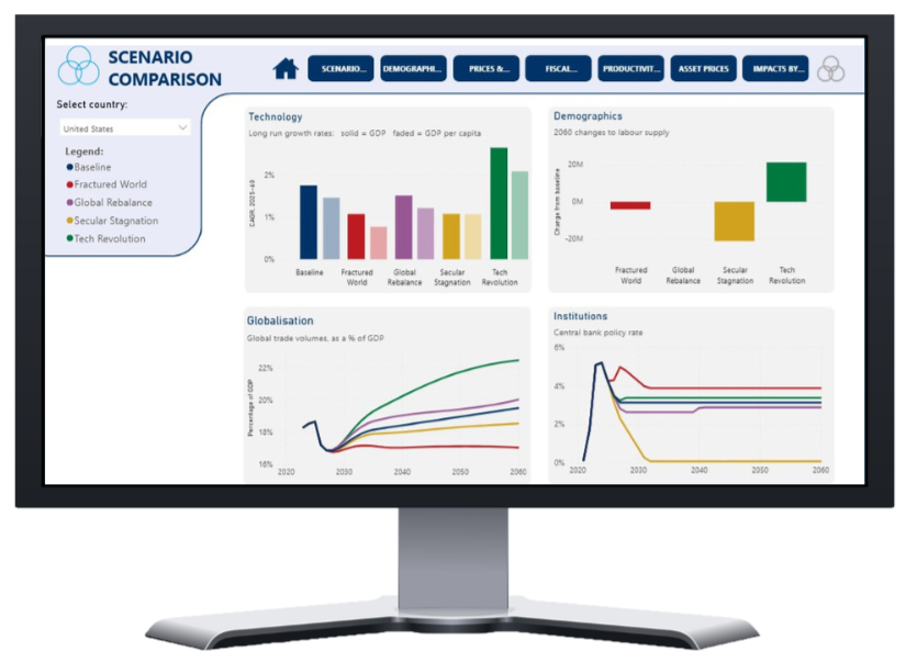 - Dashboard. Visualise and compare scenario outcomes across countries and key economic dimensions, including GDP, demographics, prices and wages, productivity, interest rates, and asset returns.