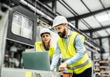 Image of people discussing graphs, pointing at a report