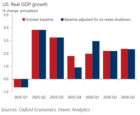事实上,我们将修正11月的基准预测(拟于11月12日发布),以反映我们对于当前持续36天的美国政府停摆的预判,我们认为其将在六周后结束。此次停摆将使美国本季度年化GDP增长率降低0.9个百分点,但会在2026年第一季度助推增长1个百分点。目前已有初步迹象表明,参议员或将就重启联邦政府达成妥协,但任何通过的法案很可能只是短期方案,这增加了12月或1月再次出现资金短缺的风险。